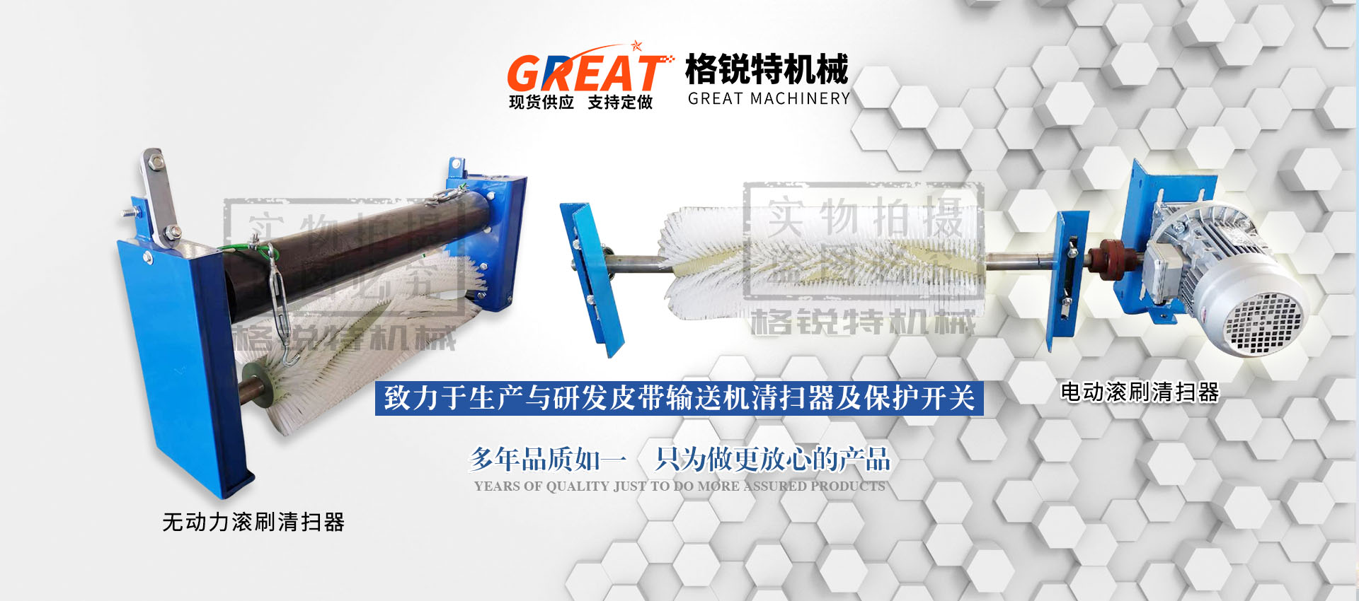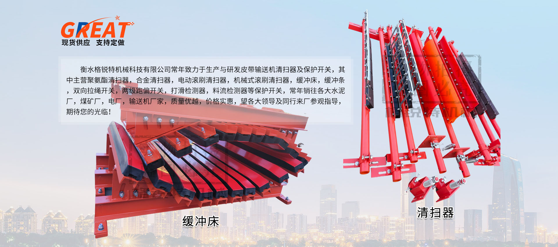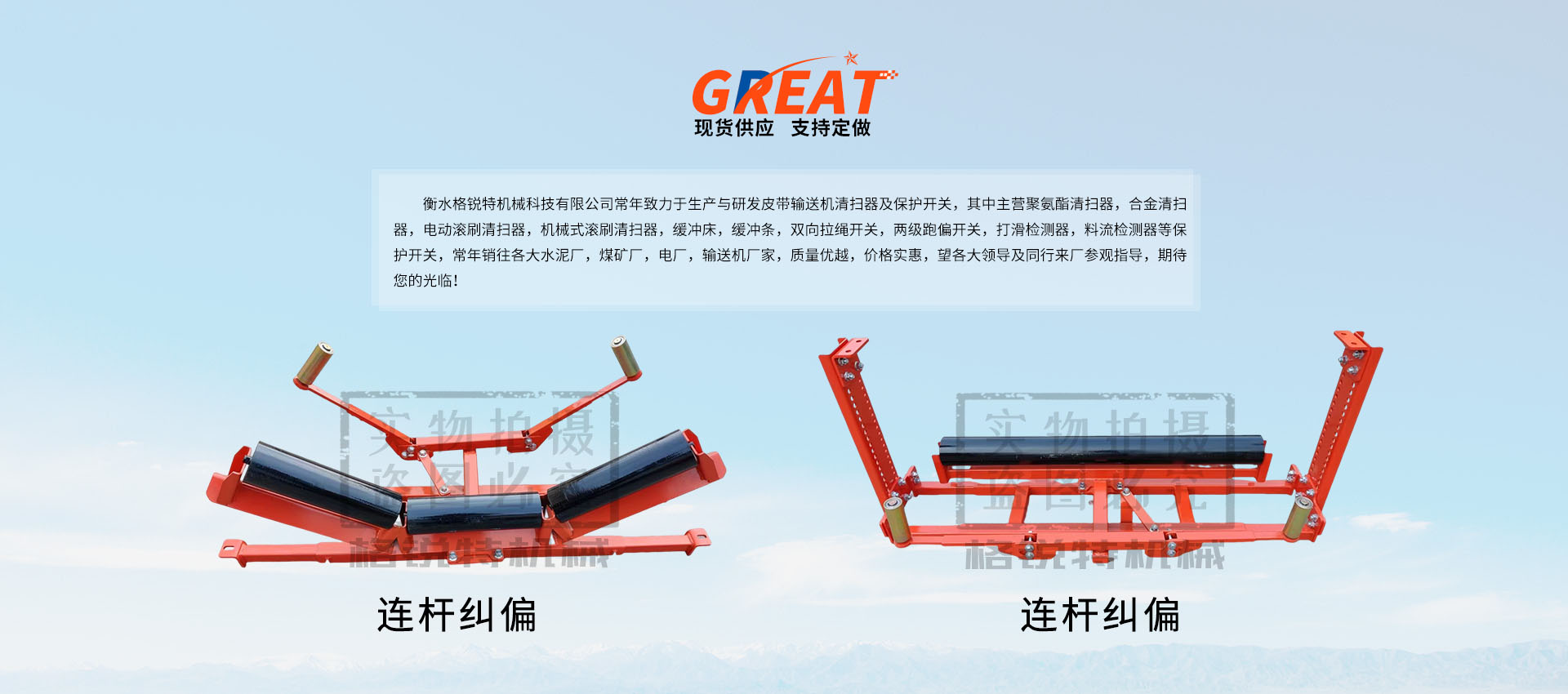 衡水格銳特機械科技有限公司常年致力于生產(chǎn)與研發(fā)皮帶輸送機清掃器及保護開關,其中主營聚氨酯清掃器,合金清掃器,電動滾刷清掃器,機械式滾刷清掃器,緩沖床,緩沖條,雙向拉繩開關,兩級跑偏開關,打滑檢測器,料流檢測器等保護開關,常年銷往各大水泥廠,煤礦廠,電廠,輸送機廠家,質量優(yōu)越,價格實惠,望各大領導及同行來廠參觀指導,期待您的光臨!!!